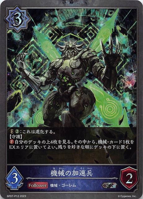 機械の加速兵 クラス ウィッチ カード種類 フォロワー タイプ 機械・ゴーレム レアリティ SR・プレミアム 収録商品 ブースターパック第7弾「森羅鋼鉄」 コスト3攻撃力3体力2 :これは進化する。【守護】自分のデッキの上4枚を見る。その中から、機械・カード1枚をEXエリアに置いてよい。残りを好きな順にデッキの下に置く。 lackBP07-P12