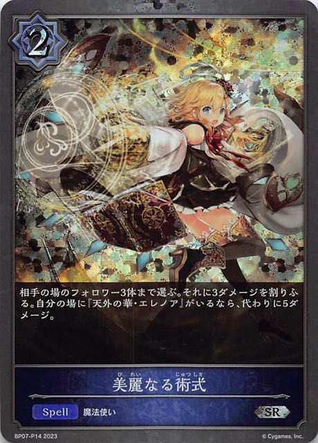 美麗なる術式 クラス ウィッチ カード種類 スペル タイプ 魔法使い レアリティ SR・プレミアム 収録商品 ブースターパック第7弾「森羅鋼鉄」 コスト2攻撃力-体力- 相手の場のフォロワー3体まで選ぶ。それに3ダメージを割りふる。自分の場に『天外の華・エレノア』がいるなら、代わりに5ダメージ。 TEDDYBP07-P14