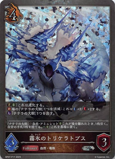霧氷のトリケラトプス クラス ドラゴン カード種類 フォロワー タイプ 自然・竜族 レアリティ SR・プレミアム 収録商品 ブースターパック第7弾「森羅鋼鉄」 コスト4攻撃力3体力3 :これは進化する。場の『ナテラの大樹』1つを消滅:これは+2/+2する。『ナテラの大樹』1つを出す。―――――――――――――――『ナテラの大樹』自然・アミュレットこれが場を離れたとき、1枚引く。自分の手札1枚を捨てる。:これを墓場に置く。 えなれいんBP07-P17