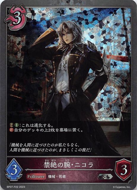 禁絶の腕・ニコラ クラス ナイトメア カード種類 フォロワー タイプ 機械・死者 レアリティ SR・プレミアム 収録商品 ブースターパック第7弾「森羅鋼鉄」 コスト3攻撃力3体力3 :これは進化する。自分のデッキの上2枚を墓場に置く。 「機械を人間に近づけたのが私たちなら、人間を機械に近づけたのが、まさしくこの彼だ」 風篠BP07-P22