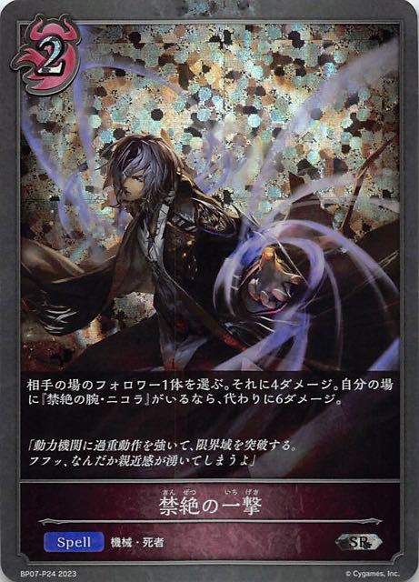 禁絶の一撃 クラス ナイトメア カード種類 スペル タイプ 機械・死者 レアリティ SR・プレミアム 収録商品 ブースターパック第7弾「森羅鋼鉄」 コスト2攻撃力-体力- 相手の場のフォロワー1体を選ぶ。それに4ダメージ。自分の場に『禁絶の腕・ニコラ』がいるなら、代わりに6ダメージ。 「動力機関に過重動作を強いて、限界域を突破する。フフッ、なんだか親近感が湧いてしまうよ」 風篠BP07-P24