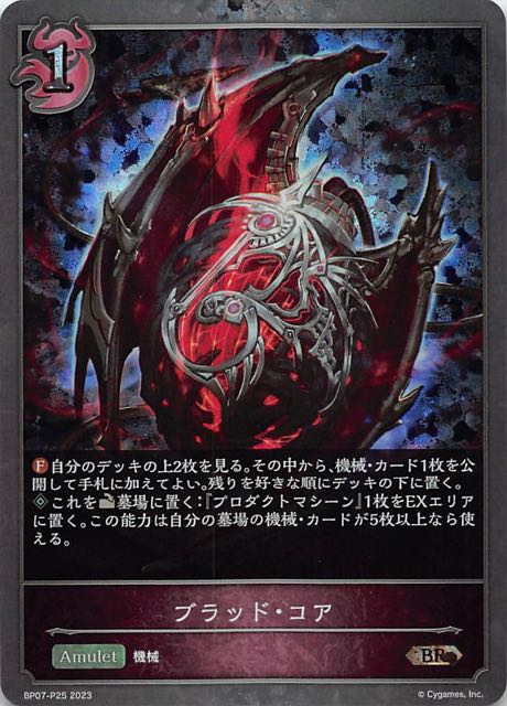 ブラッド・コア クラス ナイトメア カード種類 アミュレット タイプ 機械 レアリティ BR・プレミアム 収録商品 ブースターパック第7弾「森羅鋼鉄」 コスト1攻撃力-体力- 自分のデッキの上2枚を見る。その中から、機械・カード1枚を公開して手札に加えてよい。残りを好きな順にデッキの下に置く。これを墓場に置く:『プロダクトマシーン』1枚をEXエリアに置く。この能力は自分の墓場の機械・カードが5枚以上なら使える。 ShuLaBP07-P25