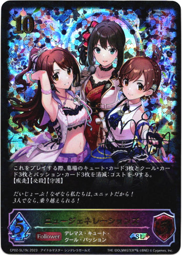 ニュージェネレーションズ クラス ニュートラル タイトル アイドルマスター シンデレラガールズ カード種類 フォロワー タイプ デレマス・キュート・クール・パッション レアリティ SL 収録商品 コラボパック「アイドルマスター シンデレラガールズ」 コスト10攻撃力5体力5 これをプレイする際、墓場のキュート・カード3枚とクール・カード3枚とパッション・カード3枚を消滅:コストを-9する。【疾走】【必殺】【守護】 だいじょーぶ!なぜなら私たちは、ユニットだから!3人でなら、乗り越えられる! CP02-SL19