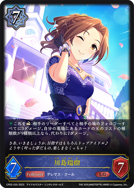 川島瑞樹 クラス ウィッチ タイトル アイドルマスター シンデレラガールズ カード種類 フォロワー タイプ デレマス・クール レアリティ LG 収録商品 コラボパック「アイドルマスター シンデレラガールズ」 コスト7攻撃力7体力7 これを:相手のリーダーすべてと相手の場のフォロワーすべてに3ダメージ。自分の墓場にあるカードの元のコストの種類数が9種類以上なら、代わりに7ダメージ。 さあ、いきましょうか。目指すはもちろんトップアイドル♪ようやく叶った夢だもの。楽しまなくっちゃ! CP02-035