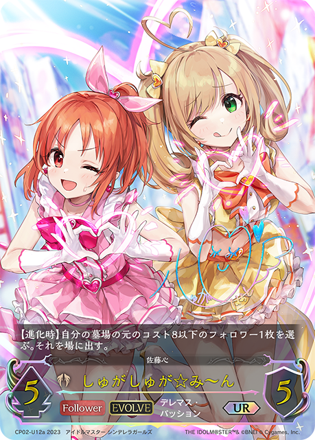 しゅがしゅが☆み〜ん クラス ビショップ タイトル アイドルマスター シンデレラガールズ カード種類 フォロワー・エボルヴ タイプ デレマス・パッション レアリティ UR 収録商品 コラボパック「アイドルマスター シンデレラガールズ」 コスト-攻撃力5体力5 【進化時】自分の墓場の元のコスト8以下のフォロワー1枚を選ぶ。それを場に出す。 CP02-U12b