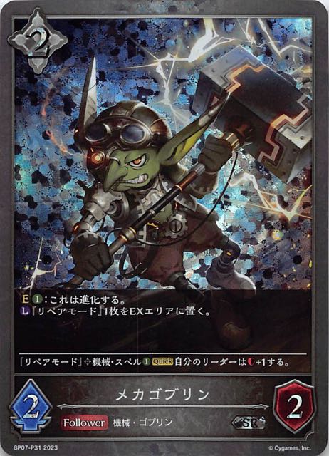 メカゴブリン クラス ニュートラル カード種類 フォロワー タイプ 機械・ゴブリン レアリティ SR・プレミアム 収録商品 ブースターパック第7弾「森羅鋼鉄」 コスト2攻撃力2体力2 :これは進化する。『リペアモード』1枚をEXエリアに置く。―――――――――――――――『リペアモード』機械・スペル自分のリーダーは+1する。 タツヤキBP07-P31