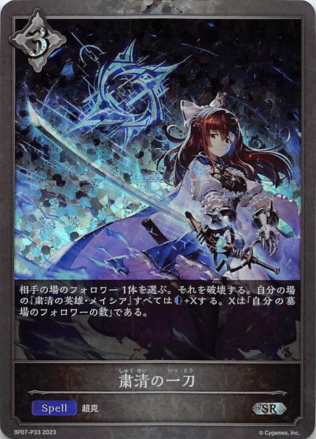 粛清の一刀 クラス ニュートラル カード種類 スペル タイプ 超克 レアリティ SR・プレミアム 収録商品 ブースターパック第7弾「森羅鋼鉄」 コスト3攻撃力-体力- 相手の場のフォロワー1体を選ぶ。それを破壊する。自分の場の『粛清の英雄・メイシア』すべては+Xする。Xは「自分の墓場のフォロワーの数」である。 ナダレBP07-P33