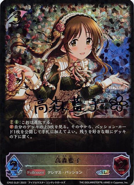 高森藍子 クラス エルフ タイトル アイドルマスター シンデレラガールズ カード種類 フォロワー タイプ デレマス・パッション レアリティ SL 収録商品 コラボパック「アイドルマスター シンデレラガールズ」 コスト3攻撃力2体力2 :これは進化する。自分のデッキの上3枚を見る。その中から、パッション・カード1枚を公開して手札に加えてよい。残りを好きな順にデッキの下に置く。 CP02-SL01
