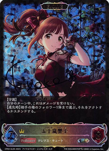 神崎蘭子 クラス ナイトメア タイトル アイドルマスター シンデレラガールズ カード種類 フォロワー タイプ デレマス・クール レアリティ SL 収録商品 コラボパック「アイドルマスター シンデレラガールズ」 コスト4攻撃力3体力3 :これは進化する。相手の場のフォロワー1体を選ぶ。それに2ダメージ。【レッスン_2】:相手の場のフォロワー2体まで選ぶ。それに2ダメージ。 CP02-SL13