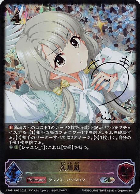 久川凪 クラス ロイヤル タイトル アイドルマスター シンデレラガールズ カード種類 フォロワー タイプ デレマス・パッション レアリティ SL 収録商品 コラボパック「アイドルマスター シンデレラガールズ」 コスト4攻撃力4体力4 墓場の元のコスト1のカード2枚を消滅:下記から2つまでチョイスする。【1】相手の場のフォロワー1体を選ぶ。それを破壊する。【2】相手のリーダーすべてに2ダメージ。【3】1枚引く。自分の手札1枚を捨てる。【レッスン_1】:これは【突進】を持つ。 CP02-SL06
