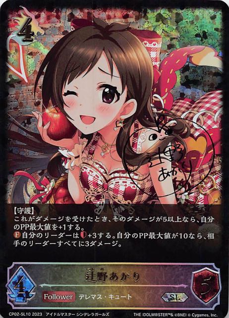 辻野あかり クラス ドラゴン タイトル アイドルマスター シンデレラガールズ カード種類 フォロワー タイプ デレマス・キュート レアリティ SL 収録商品 コラボパック「アイドルマスター シンデレラガールズ」 コスト4攻撃力4体力5 【守護】これがダメージを受けたとき、そのダメージが5以上なら、自分のPP最大値を+1する。自分のリーダーは+3する。自分のPP最大値が10なら、相手のリーダーすべてに3ダメージ。 CP02-SL10