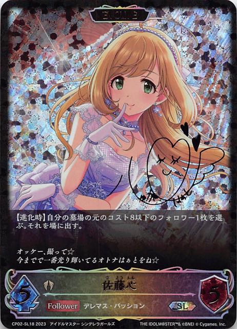佐藤心 クラス ビショップ タイトル アイドルマスター シンデレラガールズ カード種類 フォロワー・エボルヴ タイプ デレマス・パッション レアリティ SL 収録商品 コラボパック「アイドルマスター シンデレラガールズ」 コスト-攻撃力5体力5 【進化時】自分の墓場の元のコスト8以下のフォロワー1枚を選ぶ。それを場に出す。 オッケー、撮って☆今までで一番光り輝いてるオトナはぁとをね☆ CP02-SL18