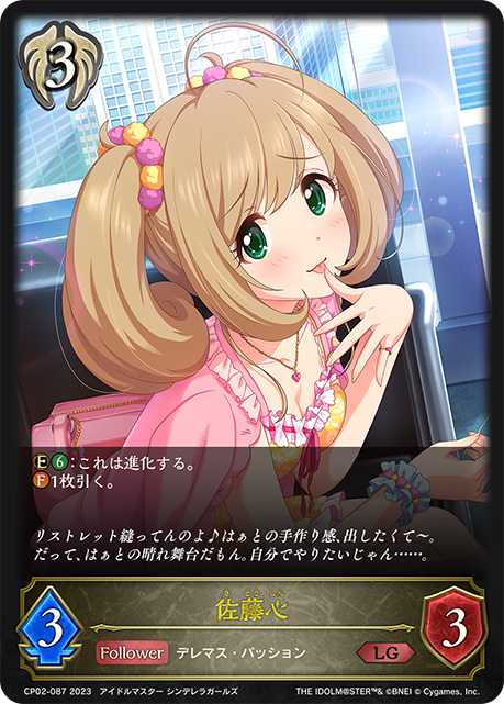 佐藤心 クラス ビショップ タイトル アイドルマスター シンデレラガールズ カード種類 フォロワー タイプ デレマス・パッション レアリティ LG 収録商品 コラボパック「アイドルマスター シンデレラガールズ」 コスト3攻撃力3体力3 :これは進化する。1枚引く。 リストレット縫ってんのよ♪はぁとの手作り感、出したくて~。だって、はぁとの晴れ舞台だもん。自分でやりたいじゃん……。 CP02-087