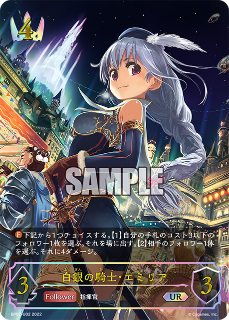 白銀の騎士・エミリア クラス ロイヤル カード種類 フォロワー タイプ 指揮官 レアリティ GR 収録商品 ブースターパック第2弾「黒銀のバハムート」 コスト4攻撃力3体力3 下記から1つチョイスする。【1】自分の手札のコスト3以下のフォロワー1枚を選ぶ。それを場に出す。【2】相手のフォロワー1体を選ぶ。それに4ダメージ。 ぽんずBP02-021