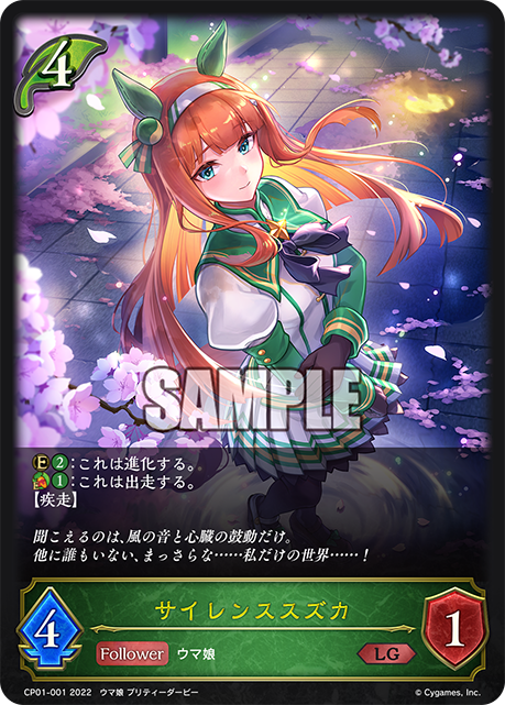 サイレンススズカ クラス エルフ タイトル ウマ娘 プリティーダービー カード種類 フォロワー タイプ ウマ娘 レアリティ LG 収録商品 コラボパック「ウマ娘 プリティーダービー」 コスト4攻撃力4体力1 :これは進化する。:これは出走する。【疾走】 聞こえるのは、風の音と心臓の鼓動だけ。他に誰もいない、まっさらな……私だけの世界……! CP01-001