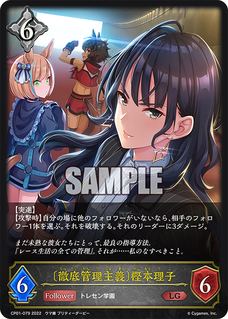 〔徹底管理主義〕樫本理子 クラス ニュートラル タイトル ウマ娘 プリティーダービー カード種類 フォロワー タイプ トレセン学園 レアリティ LG 収録商品 コラボパック「ウマ娘 プリティーダービー」 コスト6攻撃力6体力6 【突進】【攻撃時】自分の場に他のフォロワーがいないなら、相手のフォロワー1体を選ぶ。それを破壊する。それのリーダーに3ダメージ。 まだ未熟な彼女たちにとって、最良の指導方法。『レース生活の全ての管理』。それが……私のなすべきこと。 CP01-079