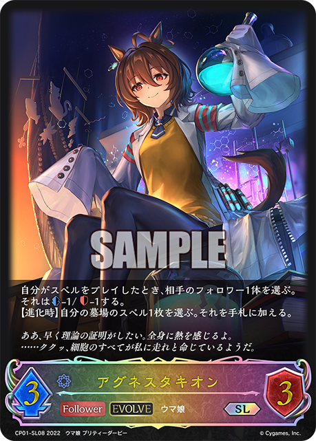 アグネスタキオン クラス ウィッチ タイトル ウマ娘 プリティーダービー カード種類 フォロワー・エボルヴ タイプ ウマ娘 レアリティ SL 収録商品 コラボパック「ウマ娘 プリティーダービー」 コスト-攻撃力3体力3 自分がスペルをプレイしたとき、相手のフォロワー1体を選ぶ。それは-1/-1する。【進化時】自分の墓場のスペル1枚を選ぶ。それを手札に加える。 ああ、早く理論の証明がしたい。全身に熱を感じるよ。……ククッ、細胞のすべてが私に走れと命じているようだ。 CP01-SL08