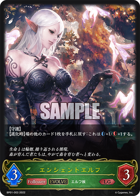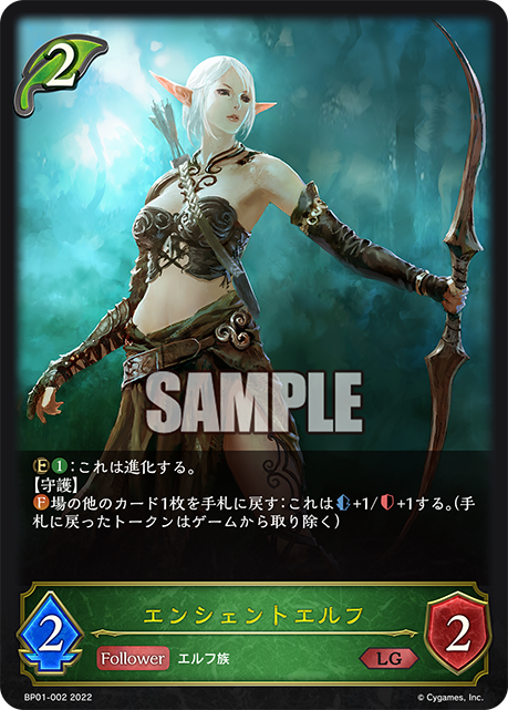エンシェントエルフ クラス エルフ カード種類 フォロワー タイプ エルフ族 レアリティ LG 収録商品 ブースターパック第1弾「創世の夜明け」 コスト2攻撃力2体力2 :これは進化する。【守護】場の他のカード1枚を手札に戻す:これは+1/+1する。(手札に戻ったトークンはゲームから取り除く) 相場良祐BP01-002