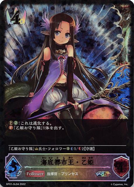 海底都市王・乙姫 クラス ロイヤル カード種類 フォロワー タイプ 指揮官・プリンセス レアリティ LG 収録商品 ブースターパック第1弾「創世の夜明け」 コスト4攻撃力3体力4 :これは進化する。『乙姫お守り隊』1体を出す。―――――――――――――――『乙姫お守り隊』兵士・フォロワー1/2【守護】 ぽんずBP01-026