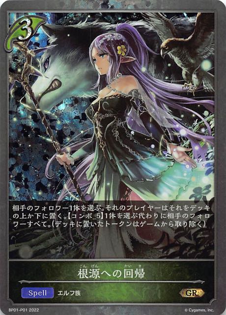 根源への回帰 クラス エルフ カード種類 スペル タイプ エルフ族 レアリティ GR 収録商品 ブースターパック第1弾「創世の夜明け」 コスト3攻撃力-体力- 相手のフォロワー1体を選ぶ。それのプレイヤーはそれをデッキの上か下に置く。【コンボ_5】1体を選ぶ代わりに相手のフォロワーすべて。(デッキに置いたトークンはゲームから取り除く) ぽんずBP01-008