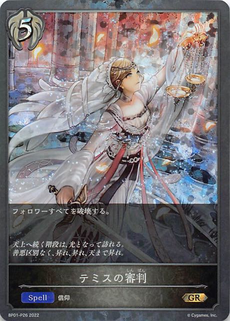 テミスの審判 クラス ビショップ カード種類 スペル タイプ 信仰 レアリティ GR 収録商品 ブースターパック第1弾「創世の夜明け」 コスト5攻撃力-体力- フォロワーすべてを破壊する。 天上へ続く階段は、光となって訪れる。善悪区別なく、昇れ、昇れ、天まで昇れ。 simeBP01-131