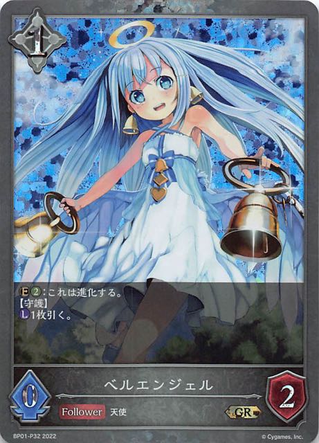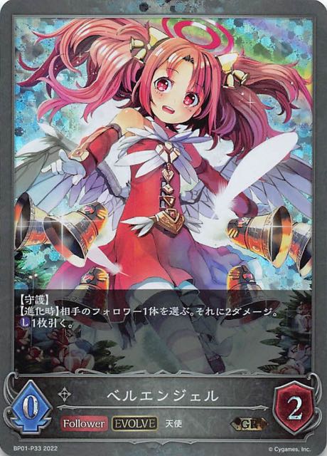 ベルエンジェル クラス ニュートラル カード種類 フォロワー タイプ 天使 レアリティ GR 収録商品 ブースターパック第1弾「創世の夜明け」 コスト1攻撃力0体力2 :これは進化する。【守護】1枚引く。 BP01-159