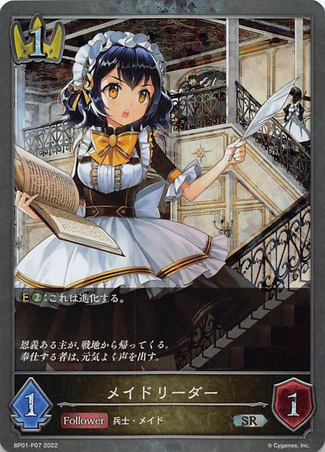 メイドリーダー クラス ロイヤル カード種類 フォロワー タイプ 兵士・メイド レアリティ SR 収録商品 ブースターパック第1弾「創世の夜明け」 コスト1攻撃力1体力1 :これは進化する。 恩義ある主が、戦地から帰ってくる。奉仕する者は、元気よく声を出す。 BP01-034