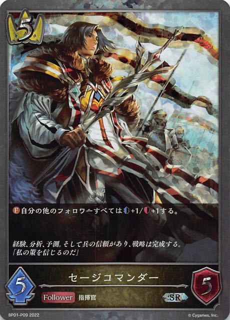 セージコマンダー クラス ロイヤル カード種類 フォロワー タイプ 指揮官 レアリティ SR 収録商品 ブースターパック第1弾「創世の夜明け」 コスト5攻撃力5体力5 自分の他のフォロワーすべては+1/+1する。 経験、分析、予測。そして兵の信頼があり、戦略は完成する。「私の策を信じるのだ」 ZENBP01-037