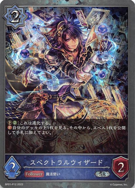 スペクトラルウィザード クラス ウィッチ カード種類 フォロワー タイプ 魔法使い レアリティ SR 収録商品 ブースターパック第1弾「創世の夜明け」 コスト2攻撃力2体力2 :これは進化する。自分のデッキの上1枚を見る。その中から、スペル1枚を公開して手札に加えてよい。 HachiBP01-059
