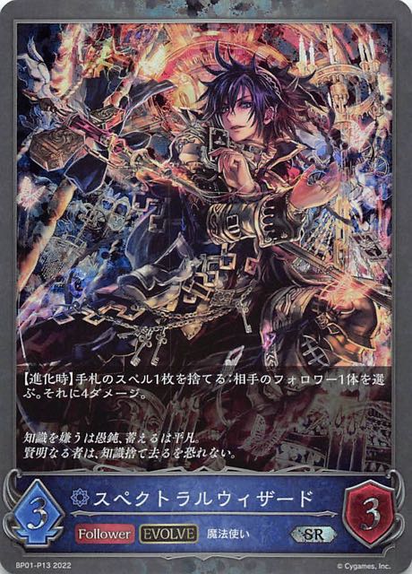 スペクトラルウィザード クラス ウィッチ カード種類 フォロワー・エボルヴ タイプ 魔法使い レアリティ SR 収録商品 ブースターパック第1弾「創世の夜明け」 コスト-攻撃力3体力3 【進化時】手札のスペル1枚を捨てる:相手のフォロワー1体を選ぶ。それに4ダメージ。 知識を嫌うは愚鈍、蓄えるは平凡。賢明なる者は、知識捨て去るを恐れない。 HachiBP01-060