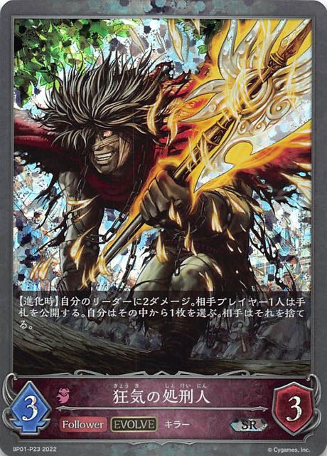 狂気の処刑人 クラス ナイトメア カード種類 フォロワー・エボルヴ タイプ キラー レアリティ SR 収録商品 ブースターパック第1弾「創世の夜明け」 コスト-攻撃力3体力3 【進化時】自分のリーダーに2ダメージ。相手プレイヤー1人は手札を公開する。自分はその中から1枚を選ぶ。相手はそれを捨てる。 BP01-111