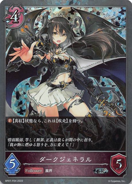 ダークジェネラル クラス ナイトメア カード種類 フォロワー タイプ 魔界 レアリティ SR 収録商品 ブースターパック第1弾「創世の夜明け」 コスト4攻撃力5体力5 【真紅】状態なら、これは【疾走】を持つ。 惰弱脆弱、等しく断罪。正義は我らが闇の中に在り。「我が胸に燃ゆる怒りを、力に変えて!」 BP01-113