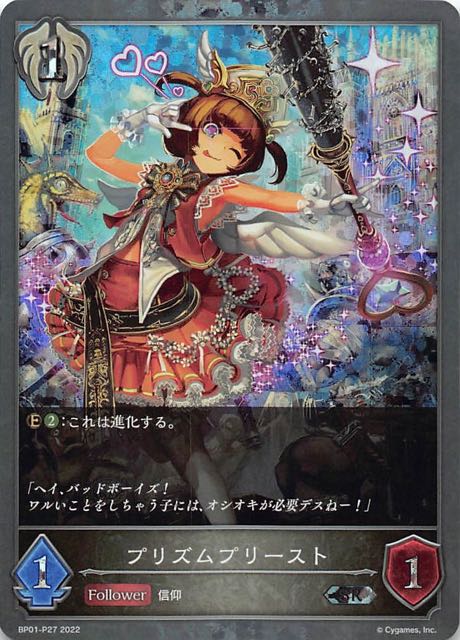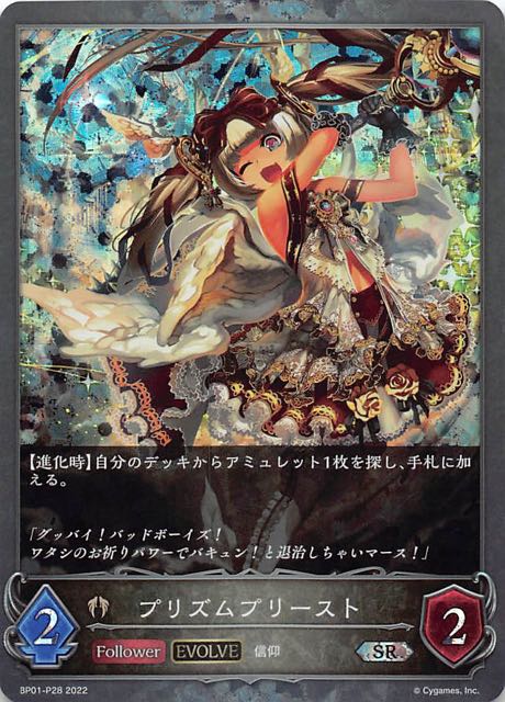 プリズムプリースト クラス ビショップ カード種類 フォロワー・エボルヴ タイプ 信仰 レアリティ SR 収録商品 ブースターパック第1弾「創世の夜明け」 コスト-攻撃力2体力2 【進化時】自分のデッキからアミュレット1枚を探し、手札に加える。 「グッバイ!バッドボーイズ!ワタシのお祈りパワーでバキュン!と退治しちゃいマース!」 ツネくんBP01-136