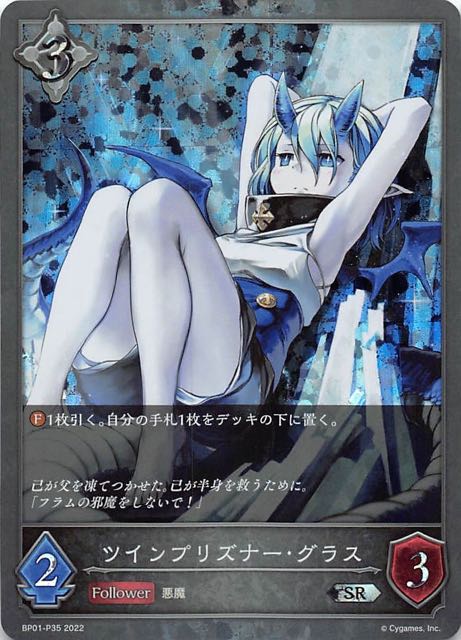 ツインプリズナー・グラス クラス ニュートラル カード種類 フォロワー タイプ 悪魔 レアリティ SR 収録商品 ブースターパック第1弾「創世の夜明け」 コスト3攻撃力2体力3 1枚引く。自分の手札1枚をデッキの下に置く。 己が父を凍てつかせた。己が半身を救うために。「フラムの邪魔をしないで!」 BP01-167