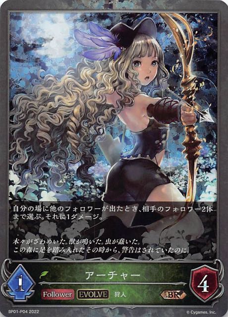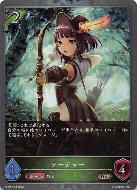 アーチャー クラス エルフ カード種類 フォロワー タイプ 狩人 レアリティ BR 収録商品 ブースターパック第1弾「創世の夜明け」 コスト2攻撃力1体力4 :これは進化する。自分の場に他のフォロワーが出たとき、相手のフォロワー1体を選ぶ。それに1ダメージ。 虹原BP01-018