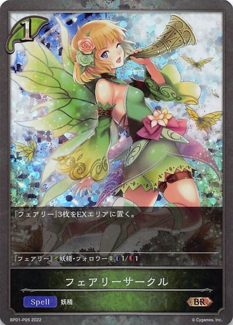 フェアリーサークル クラス エルフ カード種類 スペル タイプ 妖精 レアリティ BR 収録商品 ブースターパック第1弾「創世の夜明け」 コスト1攻撃力-体力- 『フェアリー』3枚をEXエリアに置く。―――――――――――――――『フェアリー』妖精・フォロワー1/1 若月さなBP01-023