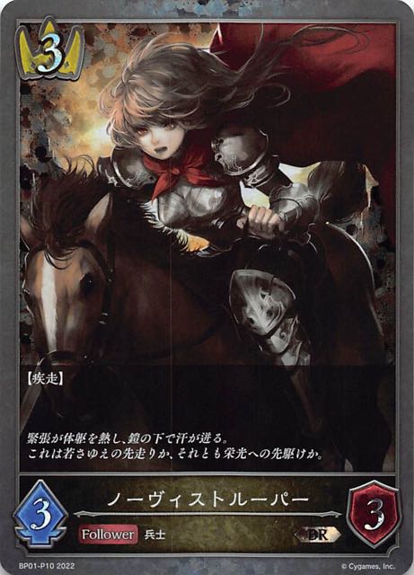 ノーヴィストルーパー クラス ロイヤル カード種類 フォロワー タイプ 兵士 レアリティ BR 収録商品 ブースターパック第1弾「創世の夜明け」 コスト3攻撃力3体力3 【疾走】 緊張が体躯を熱し、鎧の下で汗が迸る。これは若さゆえの先走りか、それとも栄光への先駆けか。 陽春BP01-048