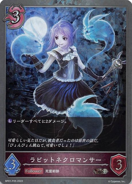 ラビットネクロマンサー クラス ナイトメア カード種類 フォロワー タイプ 死霊術師 レアリティ BR 収録商品 ブースターパック第1弾「創世の夜明け」 コスト3攻撃力3体力3 リーダーすべてに2ダメージ。 可愛らしい見た目だが、被食者だったのは前世の話だ。「ぴょんぴょん跳ねて、可愛いでしょ!」 姚亮BP01-121
