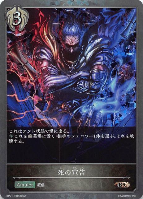 死の宣告 クラス ビショップ カード種類 アミュレット タイプ 狂信 レアリティ BR 収録商品 ブースターパック第1弾「創世の夜明け」 コスト3攻撃力-体力- これはアクト状態で場に出る。これを墓場に置く:相手のフォロワー1体を選ぶ。それを破壊する。 hikaruBP01-150
