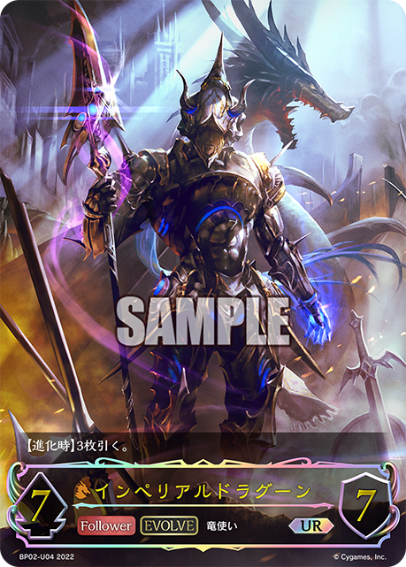 インペリアルドラグーン クラス ドラゴン カード種類 フォロワー・エボルヴ タイプ 竜使い レアリティ LG 収録商品 ブースターパック第2弾「黒銀のバハムート」 コスト-攻撃力7体力7 【進化時】3枚引く。 禁忌侵せし罪咎の痕。なれば躰は厄竜が顎。「我が槍は災禍と共に!」 あんゆBP02-053