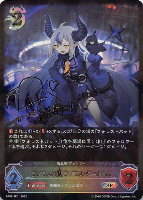 ラプラスの魔 ラプラス・ダークネス クラス ナイトメア カード種類 フォロワー タイプ 吸血鬼・プリンセス レアリティ LG 収録商品 ブースターパック第2弾「黒銀のバハムート」 コスト2攻撃力2体力2 これは+X/+Xする。Xは「自分の場の『フォレストバット』の数」である。『フォレストバット』1体を墓場に置く:相手のフォロワー1体を選ぶ。それに3ダメージ。それのリーダーに1ダメージ。 BP02-070