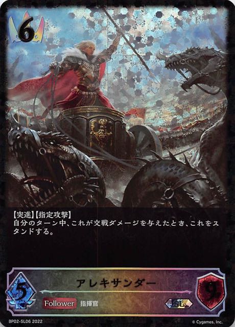 アレキサンダー クラス ロイヤル カード種類 フォロワー タイプ 指揮官 レアリティ LG 収録商品 ブースターパック第2弾「黒銀のバハムート」 コスト6攻撃力5体力9 【突進】【指定攻撃】自分のターン中、これが交戦ダメージを与えたとき、これをスタンドする。 相場良祐BP02-020