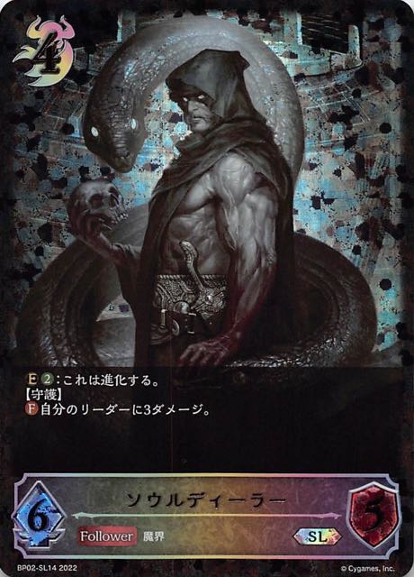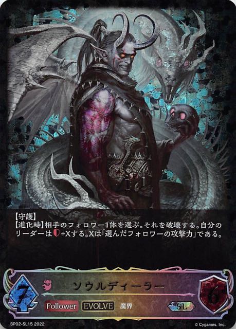 ソウルディーラー クラス ナイトメア カード種類 フォロワー・エボルヴ タイプ 魔界 レアリティ LG 収録商品 ブースターパック第2弾「黒銀のバハムート」 コスト-攻撃力7体力6 【守護】【進化時】相手のフォロワー1体を選ぶ。それを破壊する。自分のリーダーは+Xする。Xは「選んだフォロワーの攻撃力」である。 InHyuk LeeBP02-072
