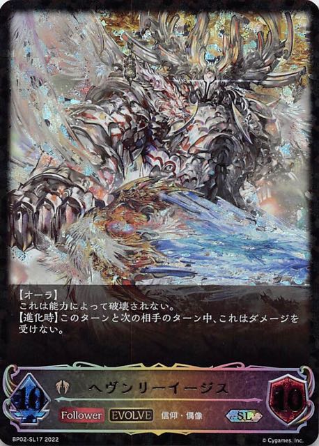 ヘヴンリーイージス クラス ビショップ カード種類 フォロワー・エボルヴ タイプ 信仰・偶像 レアリティ LG 収録商品 ブースターパック第2弾「黒銀のバハムート」 コスト-攻撃力10体力10 【オーラ】これは能力によって破壊されない。【進化時】このターンと次の相手のターン中、これはダメージを受けない。 ねじ太BP02-090