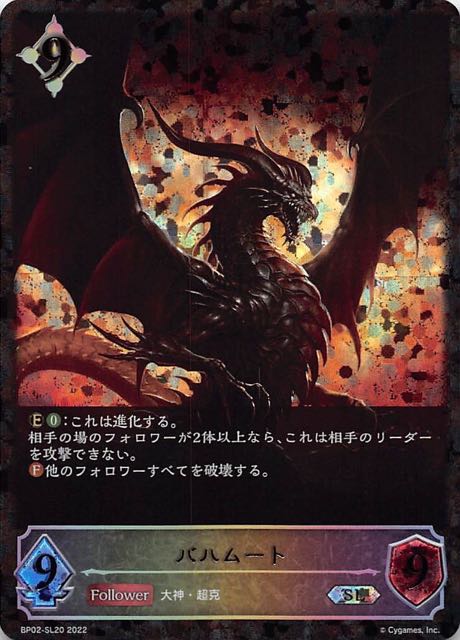 バハムート クラス ニュートラル カード種類 フォロワー タイプ 大神・超克 レアリティ LG 収録商品 ブースターパック第2弾「黒銀のバハムート」 コスト9攻撃力9体力9 :これは進化する。相手の場のフォロワーが2体以上なら、これは相手のリーダーを攻撃できない。他のフォロワーすべてを破壊する。 相場良祐BP02-107