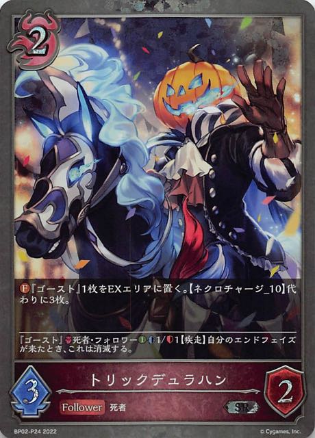 トリックデュラハン クラス ナイトメア カード種類 フォロワー タイプ 死者 レアリティ SR 収録商品 ブースターパック第2弾「黒銀のバハムート」 コスト2攻撃力3体力2 『ゴースト』1枚をEXエリアに置く。【ネクロチャージ_10】代わりに3枚。―――――――――――――――『ゴースト』死者・フォロワー1/1【疾走】自分のエンドフェイズが来たとき、これは消滅する。 ヘスンBP02-080
