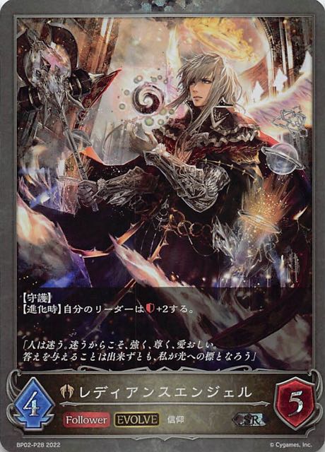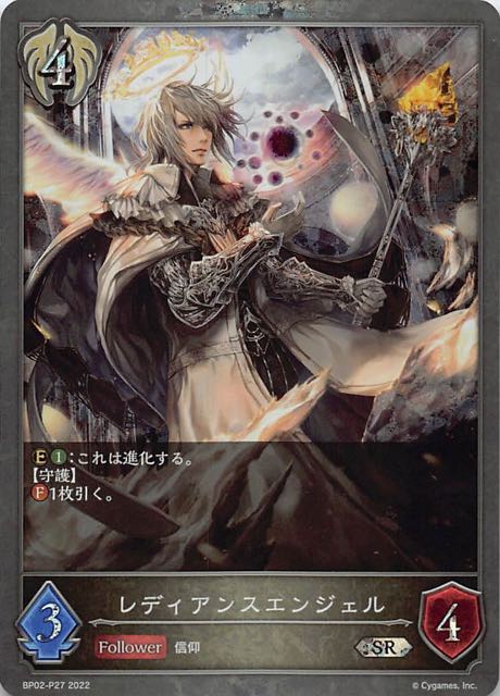 レディアンスエンジェル クラス ビショップ カード種類 フォロワー タイプ 信仰 レアリティ SR 収録商品 ブースターパック第2弾「黒銀のバハムート」 コスト4攻撃力3体力4 :これは進化する。【守護】1枚引く。 JNAMEBP02-096