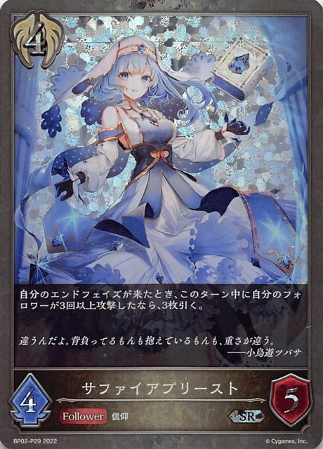 サファイアプリースト クラス ビショップ カード種類 フォロワー タイプ 信仰 レアリティ SR 収録商品 ブースターパック第2弾「黒銀のバハムート」 コスト4攻撃力4体力5 自分のエンドフェイズが来たとき、このターン中に自分のフォロワーが3回以上攻撃したなら、3枚引く。 違うんだよ。背負ってるもんも抱えているもんも、重さが違う。――小鳥遊ツバサ こーやふBP02-098