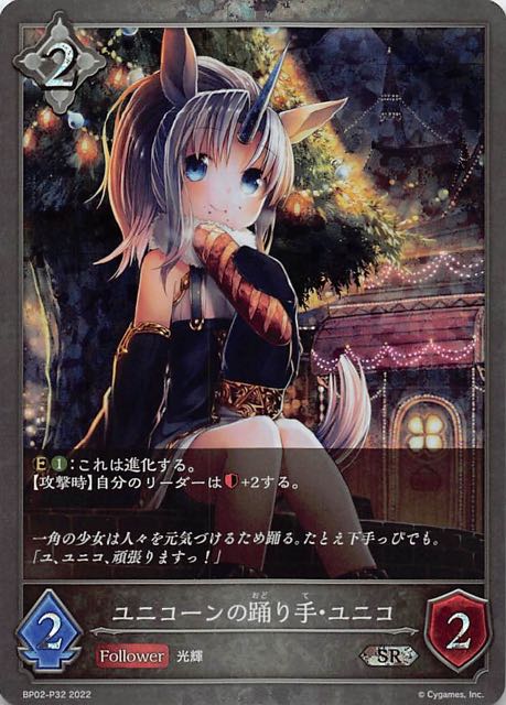 ユニコーンの踊り手・ユニコ クラス ニュートラル カード種類 フォロワー・エボルヴ タイプ 光輝 レアリティ SR 収録商品 ブースターパック第2弾「黒銀のバハムート」 コスト-攻撃力3体力3 【攻撃時】自分のリーダーは+2する。 一角の少女は人々の笑顔のため踊る。暗黒舞踊と呼ばれようと。「ユ、ユニコだって、やればできるんですっ!」 えなれいんBP02-114