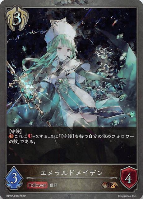 エメラルドメイデン クラス ビショップ カード種類 フォロワー タイプ 信仰 レアリティ BR 収録商品 ブースターパック第2弾「黒銀のバハムート」 コスト3攻撃力3体力4 【守護】これは+Xする。Xは「【守護】を持つ自分の他のフォロワーの数」である。 おにねこBP02-105